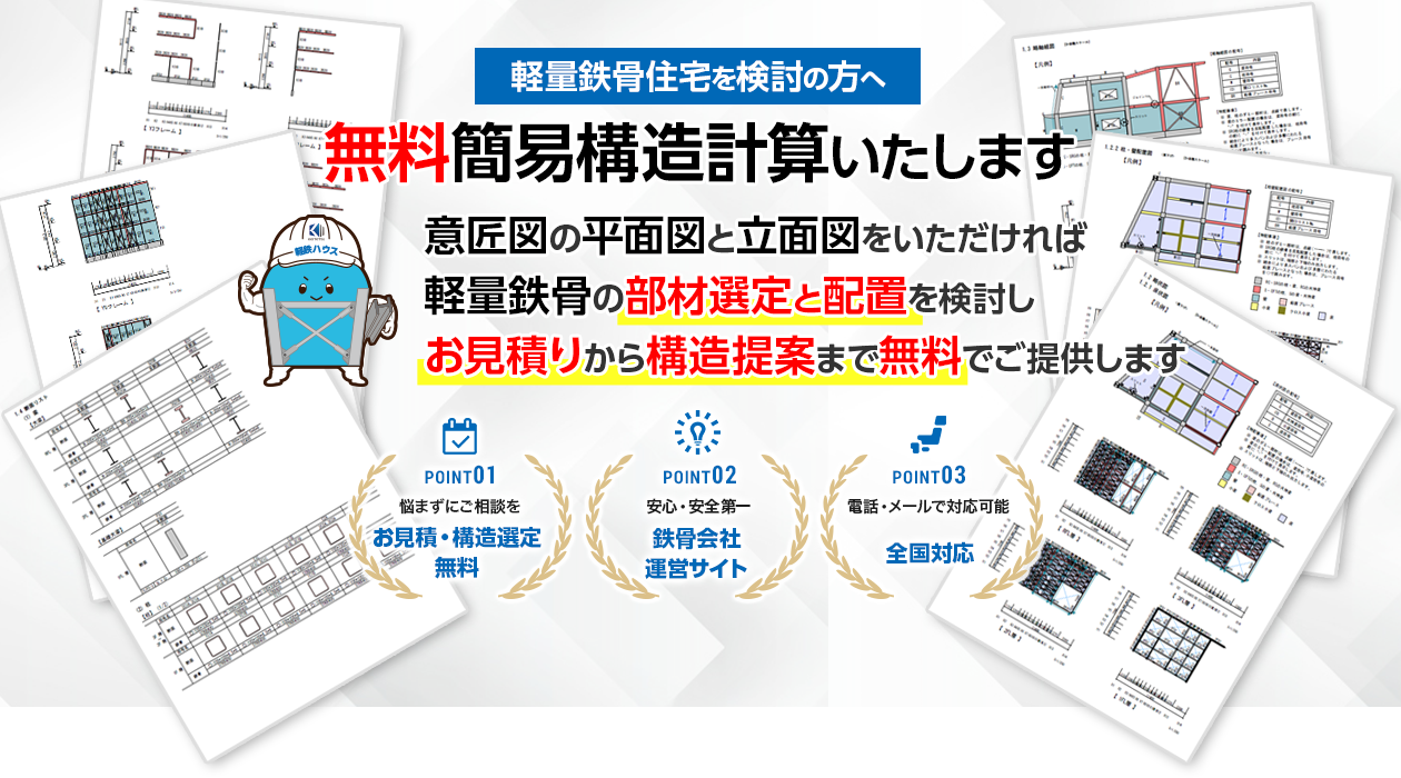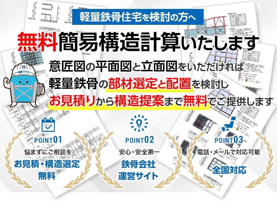 お見積りを頂く際に、軽量鉄骨の構造について聞かれることも多く、当社でとりあえず構造のたたき台を作成し、構造計算、部材選定を行った上で、お見積を提出しておりましたが、その過程をどうせならお客様へ無料で提供しようということで無料対応で行っております。