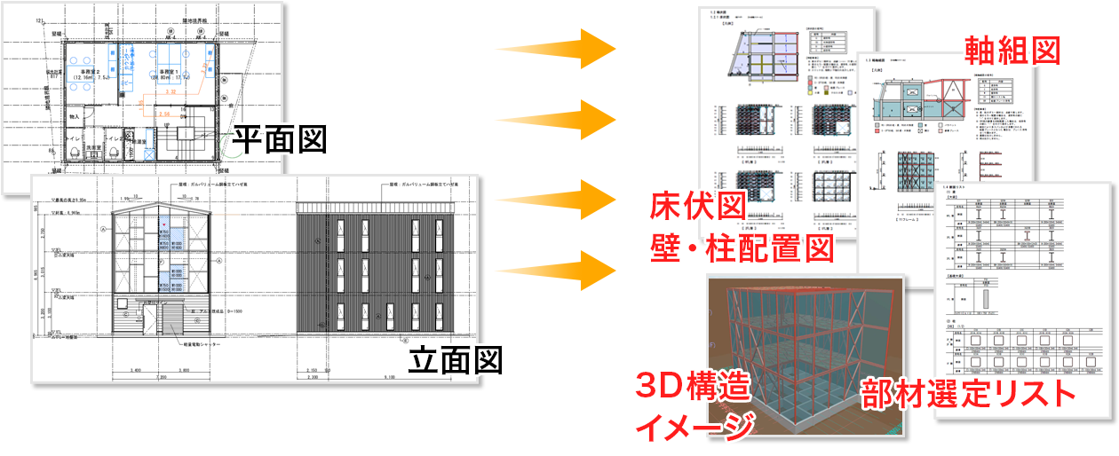 床伏図、壁・柱配置図、軸組図、部材選定リスト、お見積りまで、無料でご提出いたします。